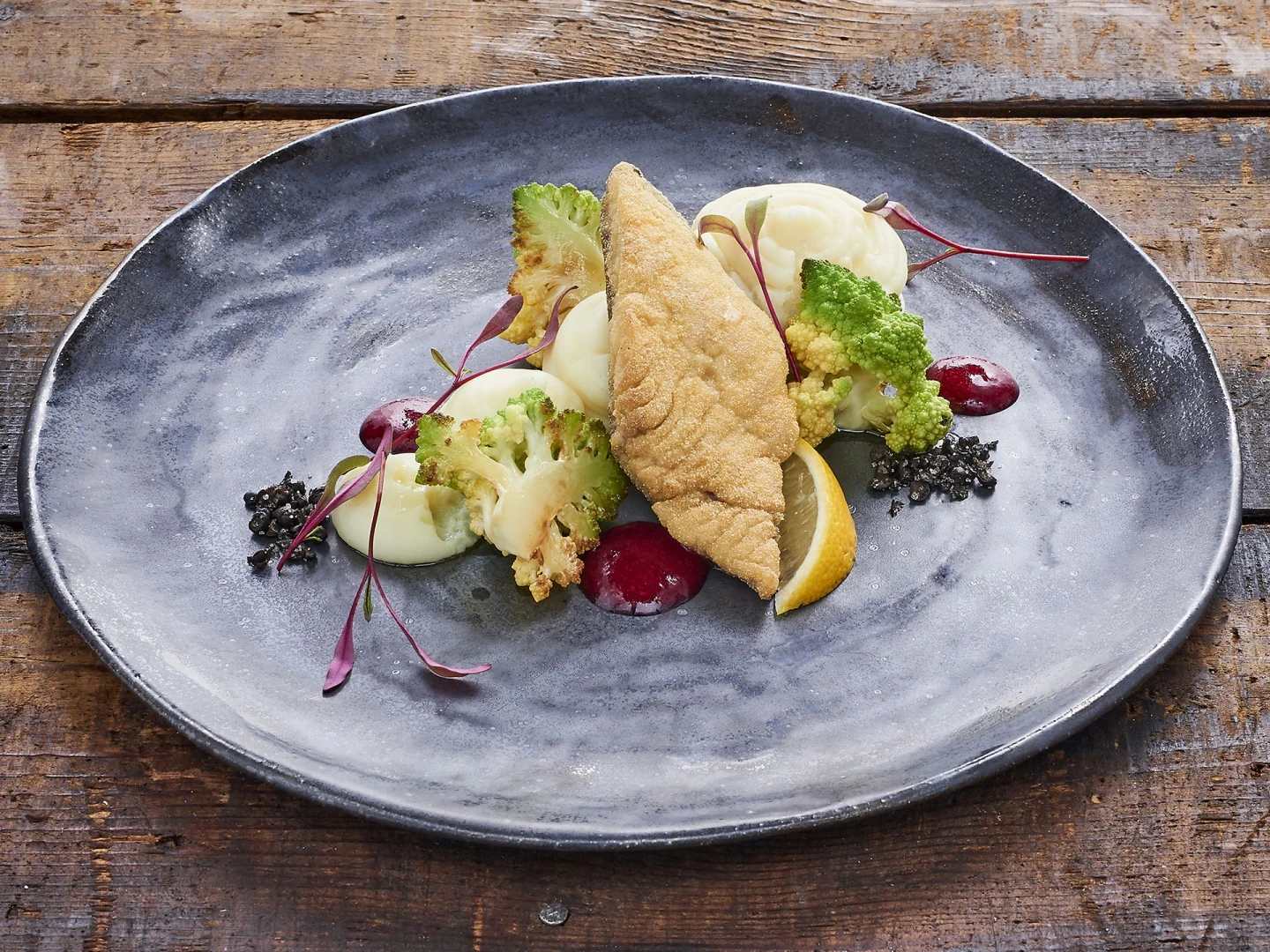 - Na talerz nałóż porcję puree, dołóż usmażonego na złoty kolor karpia, a całość podaj z kalafiorem romanesco polanym masłem.