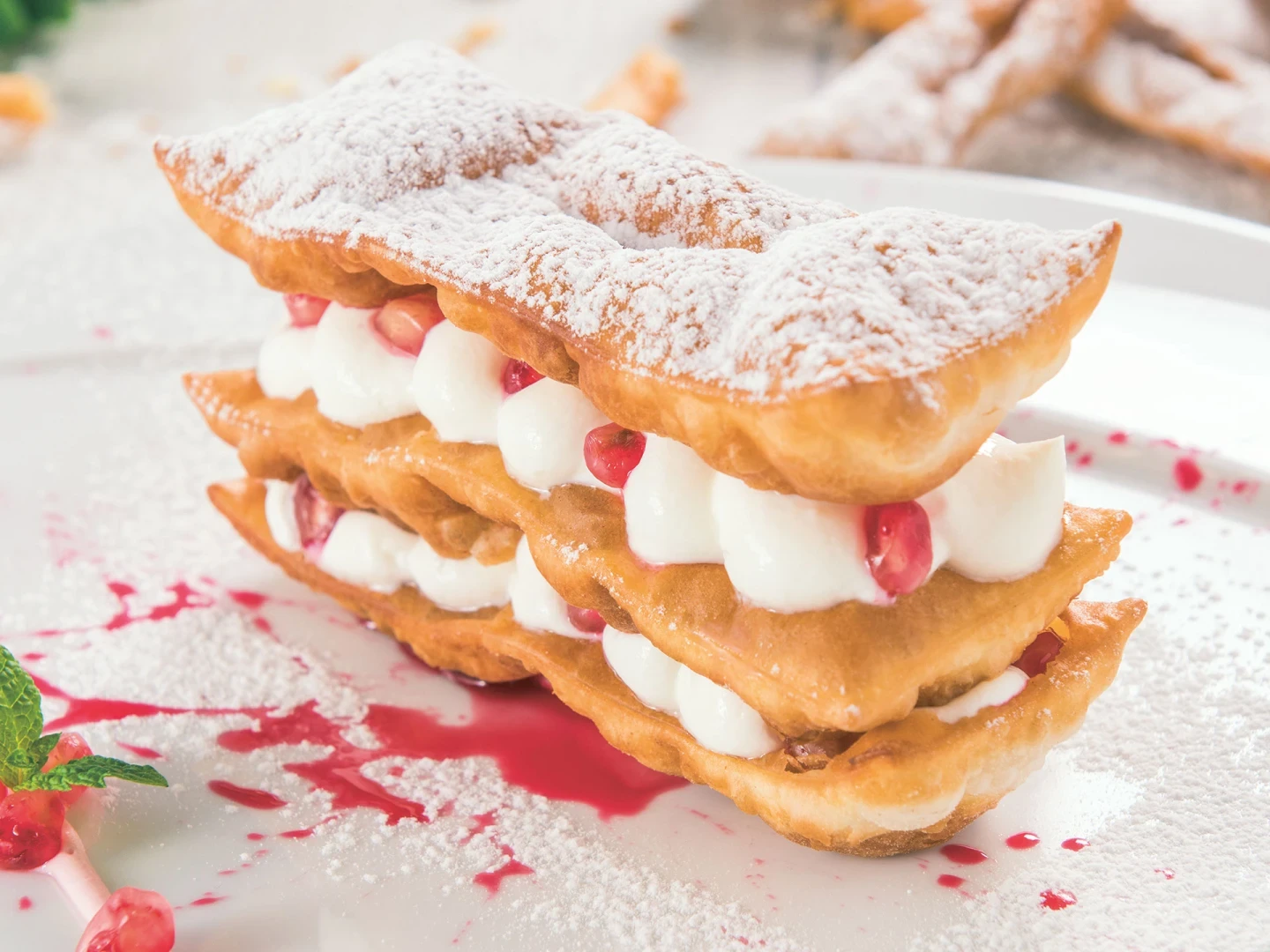 - Na blaty usmażonego ciasta faworkowego szprycuj mus twarogowy, układając na nim pestki granatu i tworząc przekładańca.